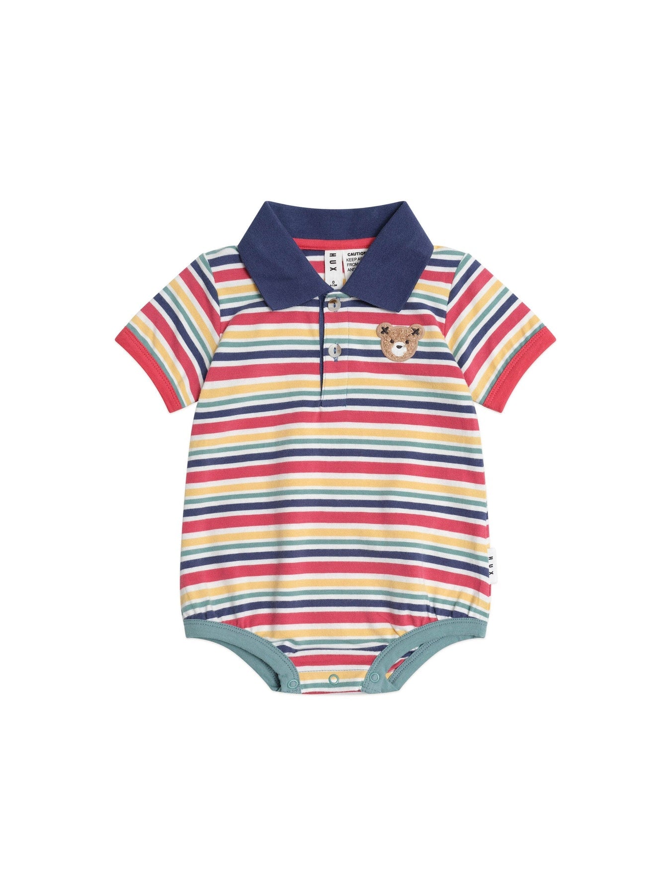 If you've been looking for 'the one', this onesie is it. Our preppy polo onesie in vintage stripes features a sporty, rugby-style collar and buttons at the neck. Made from cloud-like organic cotton, it has an embroidered Huxbear chest detail and can be dressed up or down, depending on the day.