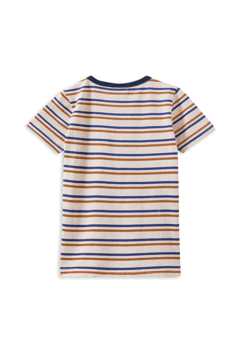 Milky Clothing Mini Stripe Pocket Tee. Add some style to your little ones summer wardrobe with this cool short sleeve t-shirt! Featuring a comfortable fit, it keeps your little one looking sharp and feeling great all day. With horizontal stripes in tan, navy, and oatmeal, plus a navy rib neckline and pocket, it's both stylish and versatile.