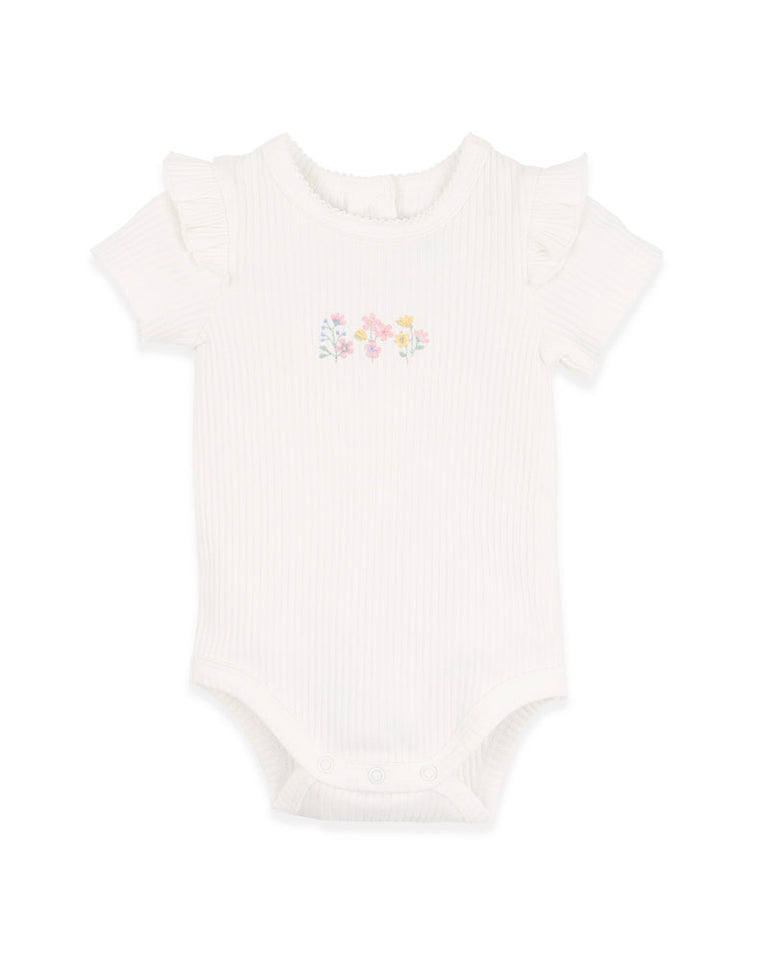 Add a sweet touch to your little one's everyday essentials with this charming ribbed bodysuit. Crafted from a soft and stretchy 95% organic cotton and 5% elastane blend, it features delicate floral embroidery at the chest and adorable frill sleeves, all finished with dainty picot trim along the neckline and sleeves for an extra pretty detail. A button opening at the back neck and convenient press studs at the crotch make dressing and nappy changes fuss-free. Perfect for layering or worn on its own, it pairs beautifully with the Bonnie Embroidered Bloomers, for an effortlessly cute outfit.