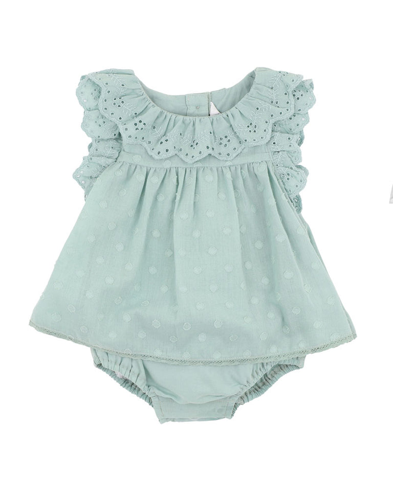 A fresh and feminine addition to your little one's wardrobe, this sweet overlay bodysuit is crafted from soft, breathable cotton with an all-over textured spot weave. Featuring a beautifully detailed broderie anglaise ruffle at the neckline and sleeves, this one-piece offers cuteness and charm with the comfort and practicality of a bodysuit. Designed in a soft dusky sage tone, it includes an attached bodysuit underneath with elasticated legs and snap closures for easy changes.
