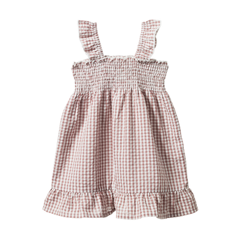 The Gala Dress is a stunning style made from 100% organic cotton woven seersucker. A versatile piece, it features gathered frill straps, a bodice with shirring elastic and a ruffle neckline