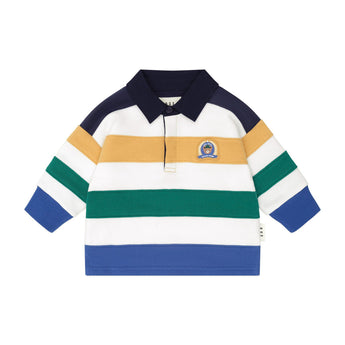 This classic rugby fleece jersey features a sporty collar and three buttons at the neck. Made from cloud-like organic cotton, it features colour blocked panels and a peekaboo varsity Huxbear detail.