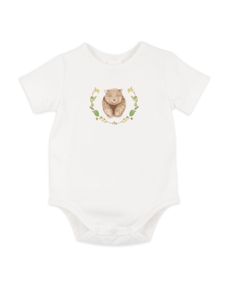 Add a little native charm to your little one's everyday essentials with this sweet Wombat Bodysuit, made from soft and breathable 100% Organic Cotton. Featuring a hand-illustrated wombat nestled within a delicate wreath of Australian flora, this unisex design offers a gentle, earthy look perfect for playtime, outings or gifting. Designed for all-day comfort, it features a classic crew neckline with a press stud shoulder opening for fuss-free dressing and snap closures at the crotch for easy changes. For a coordinated look, pair it back with our Australiana print leggings or shorts.
