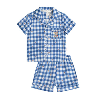 Made from soft cotton sateen, these pyjamas feature an all over custom navy check print, a soft and stretchy waistband to keep little tummies comfy and a special front pocket with Huxbear embroidery.